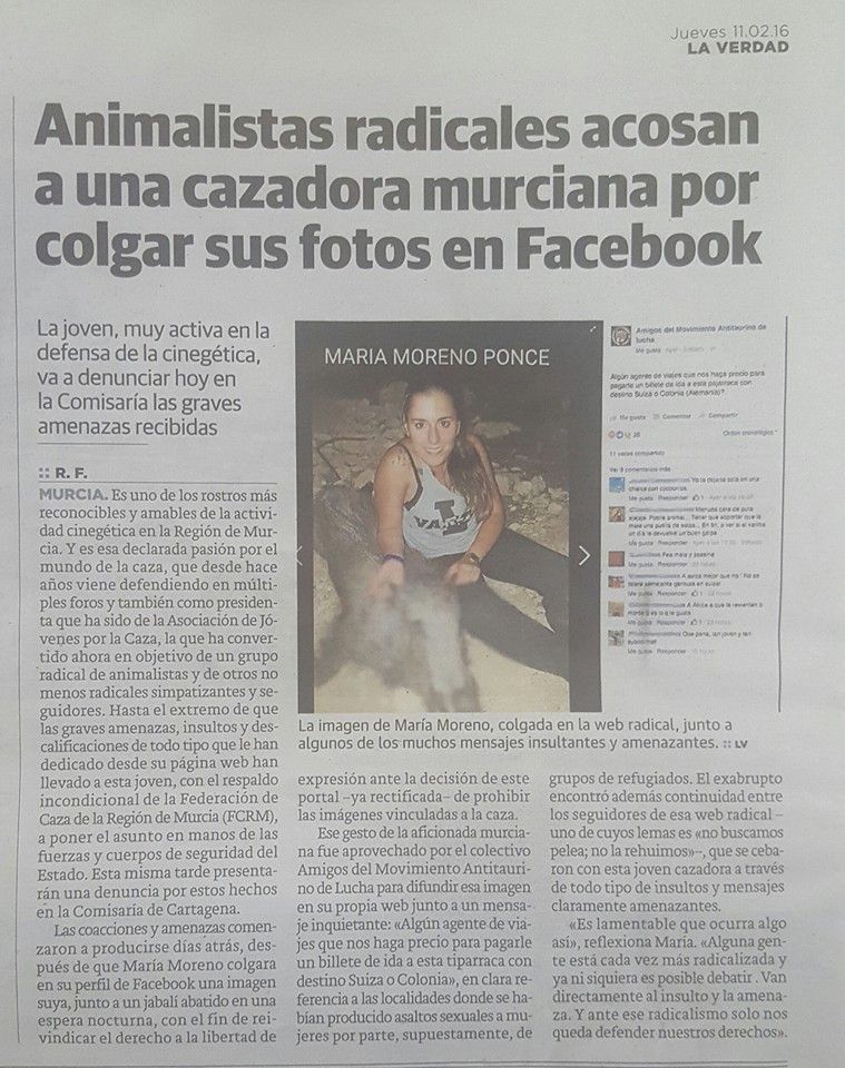 Esta es mi amiga Maria , una chica joven que ama la caza en su mas amplio sentido . A su corta edad , pues es jovencita aun , tiene un largo bagaje cinegetico  y ha vivido muchísimas experiencias de la mano de su padre, buenas y malas en el ámbito de la caza mayor y menor . El asunto es que desde hace poco tiempo atrás hay una banda de subnormales ( no deficientes ni disminuidos psíquicos  , subnormales de verdad ) que se dedican a acosarla en su pagina de Facebook y en su blog , porque se le ocurrió que ella tenia derecho a expresar ese sentimiento libremente en la red publicando fotos de caza . Pues nada mas lejos de la realidad , esta panda de  ........................ os dejo a vuestro criterio el calificativo , armados de todos sus derechos y capacidades se están encargando de demostrarnos que los cazadores somos ciudadanos de segunda y que ni tenemos ni podemos aspirar a los mismo derechos y libertades que los naturalistas , ecologistas , animalistas , por el hecho de la actividad cinegetica que realizamos de manera completamente legal , totalmente reglamentada y sometida a una legislación a mi gusto demasiado escrupulosa . El caso es que cada vez mas ocurren estos sucesos esperpenticos e intolerables a los cuales nadie  pone coto y llegara el momento en que saldrán de la red y nos lo harán en la sierra como ya esta ocurriendo en Francia, es cuando menos inquietante la noticia.